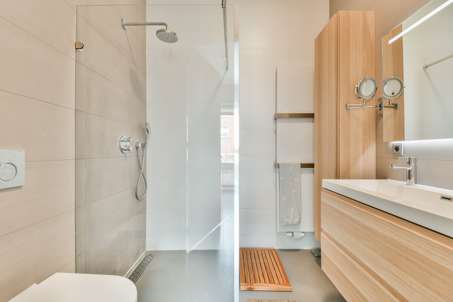 The top floor houses an additional bedroom with a spacious walk-in closet. The hall leading to this room is currently set up as a workspace and provides access to a sunny south-facing roof terrace, which can also serve as a hobby area.