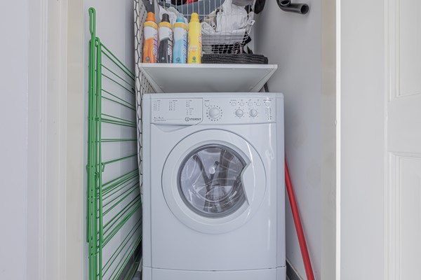 The hallway provides access to the bathroom with a washbasin and walk-in shower. There is a separate toilet and a utility closet housing the central heating system and washing machine connection.