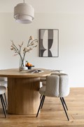The open kitchen with an island is equipped with a dishwasher, fridge with freezer, gas stove, and oven. The kitchen offers plenty of storage space, partly thanks to the island with cabinets. Next to the kitchen is a pantry with additional storage.