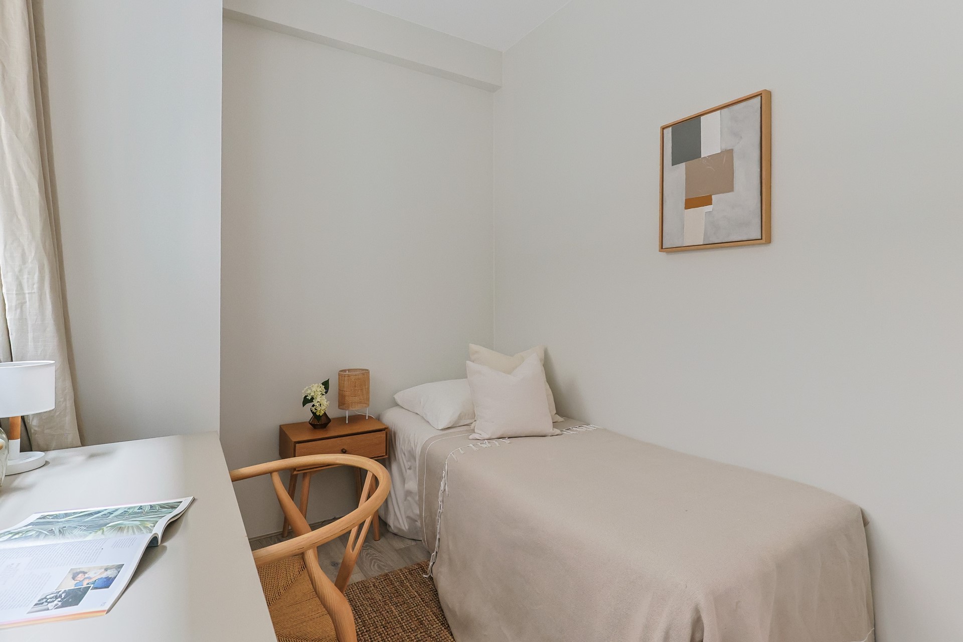 The hallway provides access to all rooms and leads into the spacious living room with French doors opening onto the sunny south-facing terrace overlooking the inner gardens. Here, you can enjoy the sun all day long.